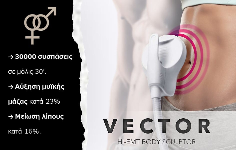 Το νέο προηγμένο τεχνολογικά σύστημα ιατρικής αισθητικής Vector Body Sculptor για γυναίκες και άντρες, προσφέρει ολοκληρωτική ενεργοποίηση της κάθε μυϊκής ομάδας, που σε αντίθεση με την φυσική άσκηση όπου δραστηριοποιείται μόνο μέχρι το 70% του μυός, με το Vector Body Sculptor πετυχαίνουμε την ενεργοποίηση του 100% του μυός!